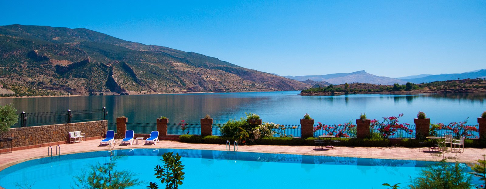 Sur les magnifiques rives du lac Bin el Ouidane Nous avons choisi le site unique et majestueux du lac Bin el Ouidane pour implanter notre nouvel établissement (pieds dans l’eau). Situé à 45 minutes de Béni-Mellal, l’hôtel Chems du Lac a ouvert ses portes début 2010. Il propose 87 chambres et 4 suites aménagées par un habile mélange entre tradition, confort et harmonie avec le site.